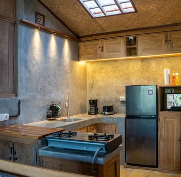 Fully appointed kitchen with fridge, gas cooktop & hot/cold water dispenser—with cooking/eating/drinking utensils for up to 12