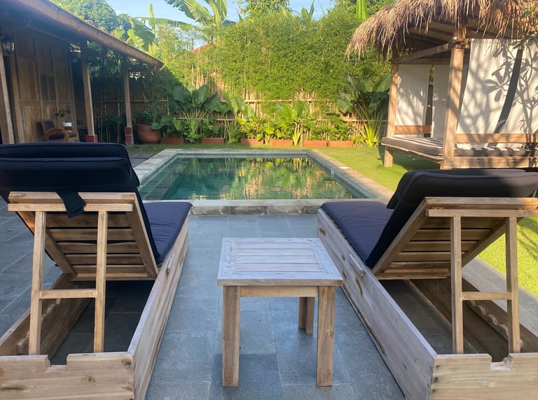 Amazing natural stone-clad swimming pool with tiled sun decks, cozy teak loungers and a comfortable bale (with its own light/small fan and charging station)